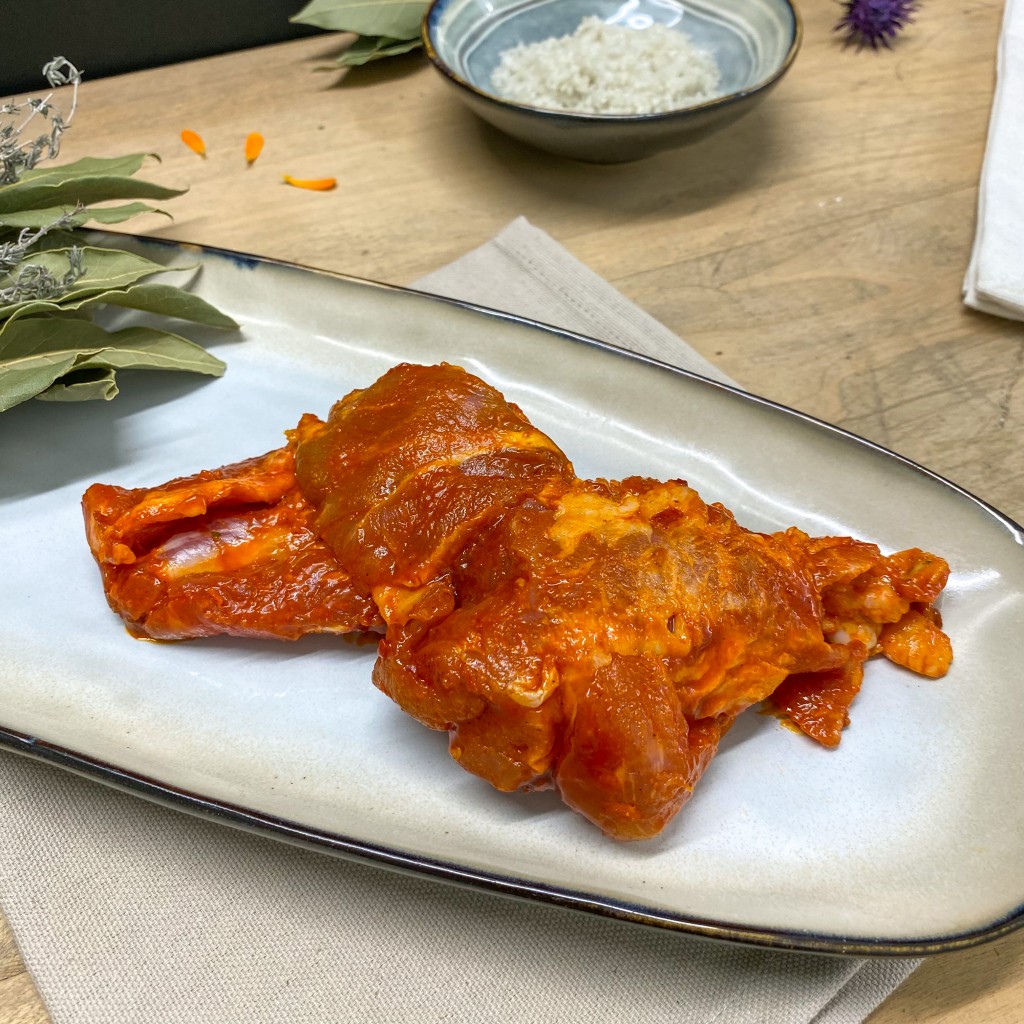 Muscle de porc très tendre mariné à la sauce texane (paprika, ail, cumin, origan, poivrons & piments). , Viande à faire au barbecue ou à la poêle.