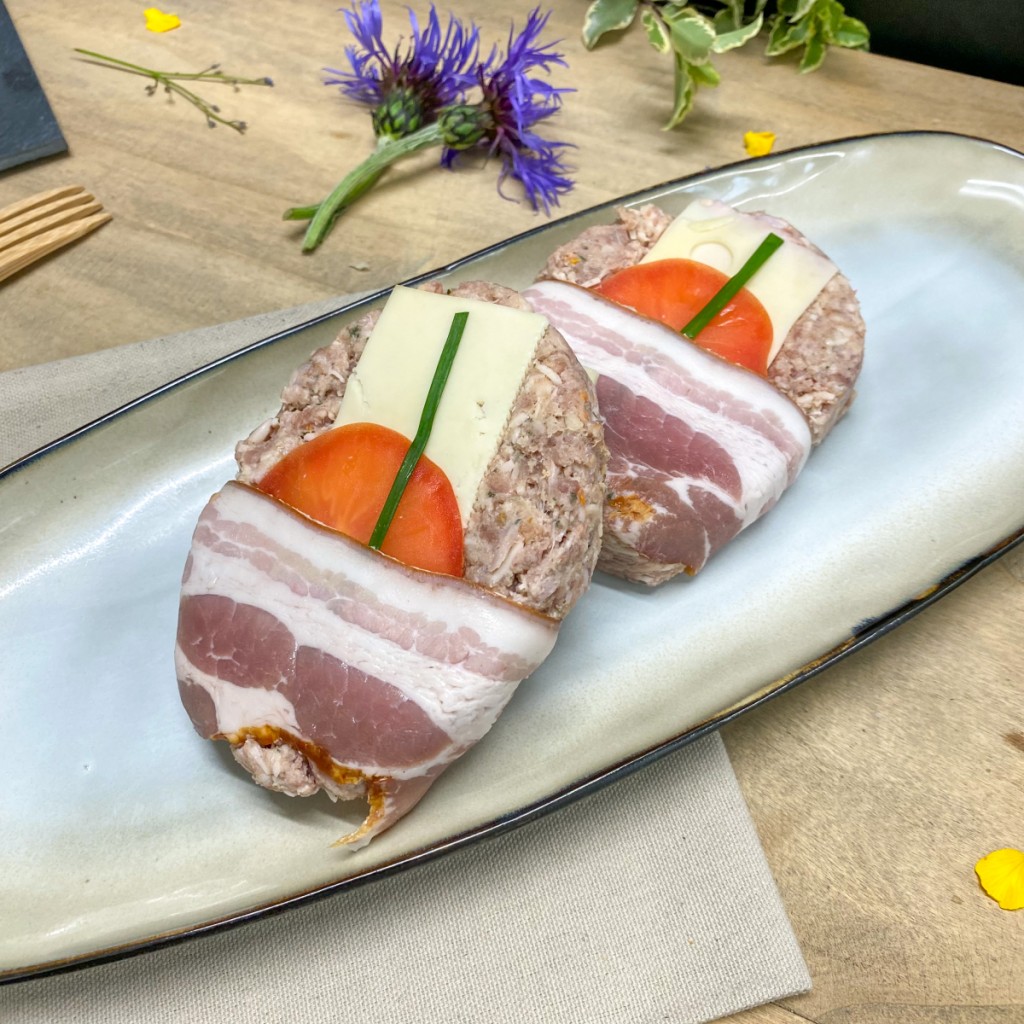 Pavé artisanal de veau haché, crème fraîche emmental, poitrine fumée et tomate. Un pavé simple et rapide à faire à la poêle.