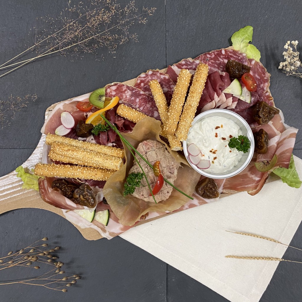 Rillette d'oie, magret de canard fumé, figues, speck de montagne, saucisson sec au poivre vert, flûtes sésame & fromage à tartiner